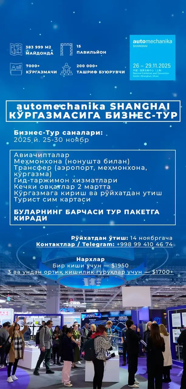Automechanika Shanxay barqaror kelajakni ta'minlaydigan innovatsiyalar va transformatsiyalarga e'tibor qaratadi, yashil dunyoga hissa qo'shadigan zamonaviy avtomobil mahsulotlari, xizmatlari va texnologiyalarini ta'kidlaydi. Tadbir turli haydovchilik texnologiyalari va transport vositalari kontseptsiyalari uchun komponentlar va shassilarni, shuningdek, dvigatel elektronikasini, transport vositalarining yoritilishini, elektr tizimlarini va boshqalarni namoyish etadi. Bu yil tadbir 7,000 ko'rgazmachi bilan rekord ishtirokni kutmoqda, Shanxay Milliy Ko'rgazma va Konventsiya Markazining 383,000 kvadrat metr maydonidan to'liq foydalanib - bu uning tarixidagi eng katta miqyos. Savdo yarmarkasi marketing, savdo, bilim almashinuvi va ta'lim uchun platforma sifatida xizmat qiladi, barqarorlikka asoslangan rivojlanishlarni ta'kidlaydigan o'zgaruvchan bozor tendentsiyalariga moslashadi.
